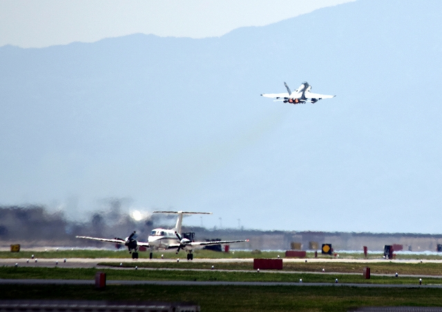 米海兵隊 F/A-18D ホーネット 戦闘攻撃機(岩国基地)、DT、02番機が離陸下には米海兵隊 UC-12F 輸送機(岩国基地) |