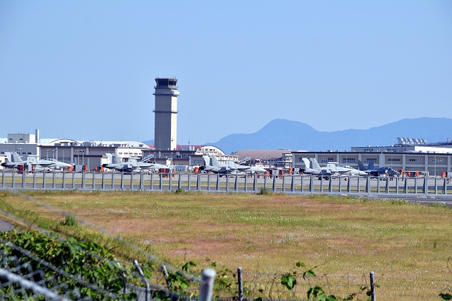 駐機場に戻った米海軍艦載機 EA-18G グラウラー 電子戦機(三沢基地)、NL、544番機、542番機、541番機、540番機。そして飛んでいない543番機(三角橋から) |
