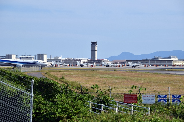 全日空旅客機定期便は米海軍艦載機 EA-18G グラウラー 電子戦機(三沢基地)、4機の前を通ってターミナルに向かいます。