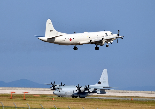 米海兵隊 KC-130 J 空中給油機 スーパーハーキュリーズ(岩国基地)、926番機の上に海上自衛隊 OP-3C 画像データ収集機(岩国基地)、34番機 |