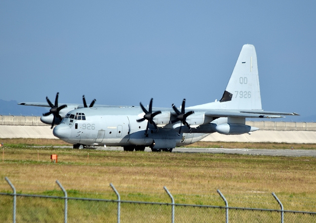 米海兵隊 KC-130 J 空中給油機 スーパーハーキュリーズ(岩国基地)、926番機がエンジンテストか轟音鳴らし続けます。とっても話は出来ません。 |