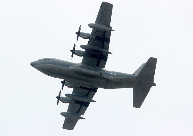 米海兵隊 KC-130 J 空中給油機 スーパーハーキュリーズ(岩国基地)、763番機が旋回(2周目) |