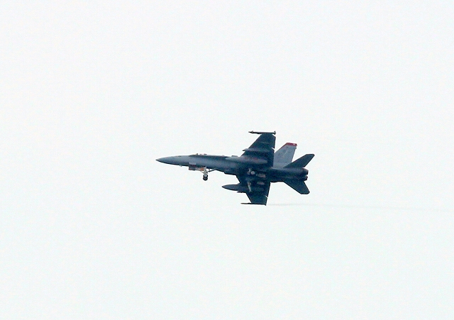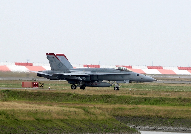 米海兵隊 F/A-18C ホーネット 戦闘攻撃機(岩国基地)、WT、17番機が着陸 10時50分頃離陸した機ということです。 |