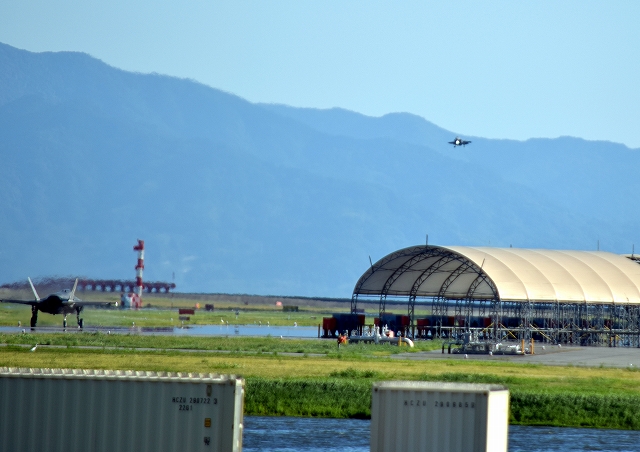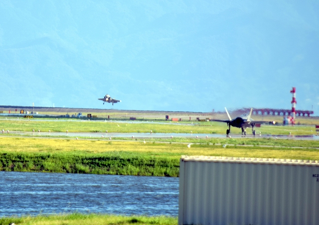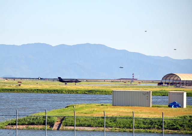 米海兵隊 F-35B ステルス 戦闘機(岩国基地)、VK、04番機、06、07番機、09が降りてきます。 |