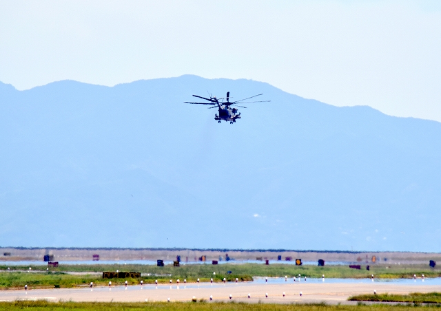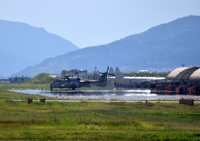 昨日着陸した米海兵隊 CH-53E 重輸送ヘリ スーパースタリオン(普天間基地)が出てきました。オスプレイと一緒に北海道で日米共同訓練に加わって戻ってきた機です。 |