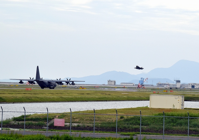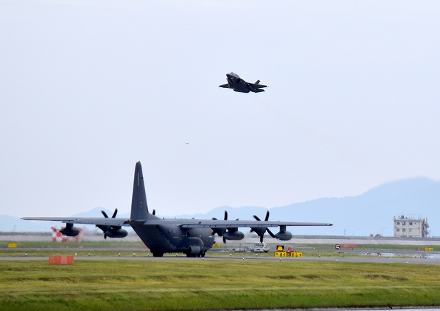 米空軍 MC‐130J 特殊作戦機 (嘉手納基地)、2機目のい向こうで米海兵隊 F-35B ステルス 戦闘機(岩国基地)、VK、01番機が離陸 |