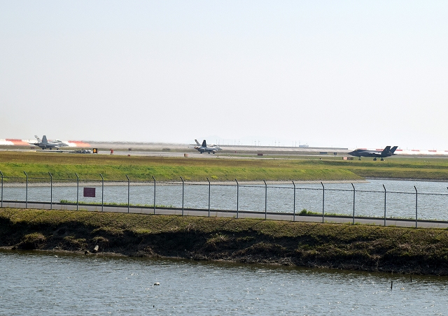 米海兵隊 F-35B ステルス 戦闘機(岩国基地)、VK、01番機の前を米海兵隊 F/A-18D ホーネット 戦闘攻撃機(岩国基地)、DT、01番機、11番機が走ります。 |