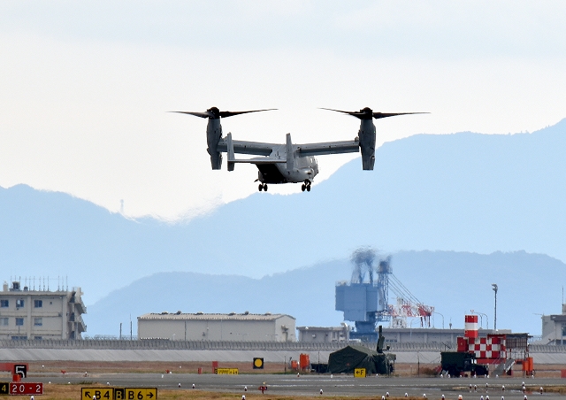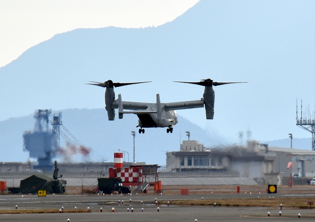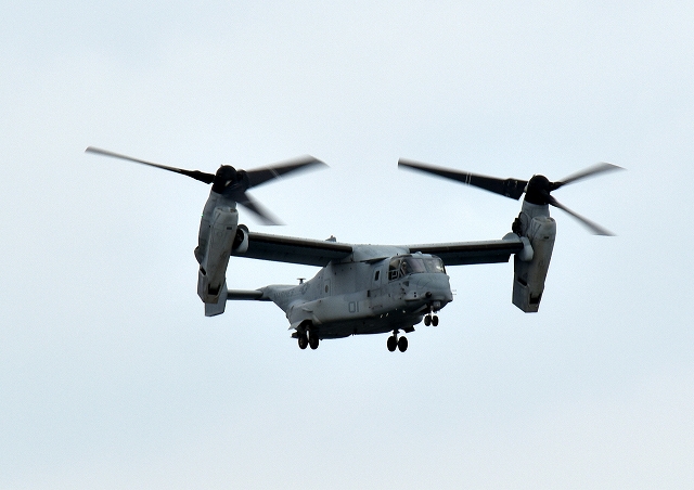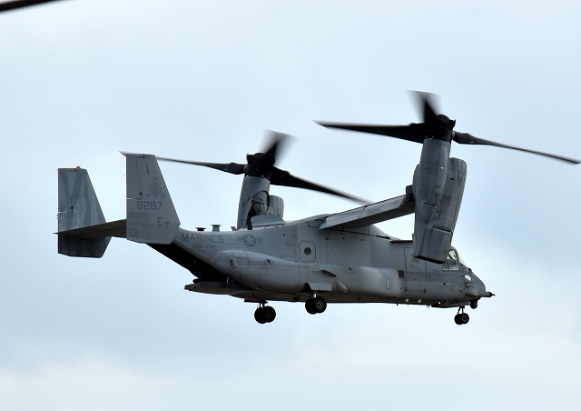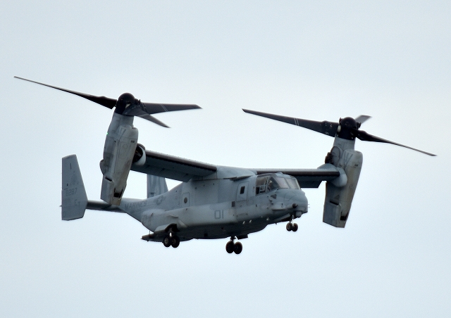 米海兵隊 MV-22B オスプレイ(普天間基地)、「虎」、01番機がおりてきます。 |
