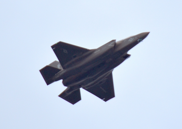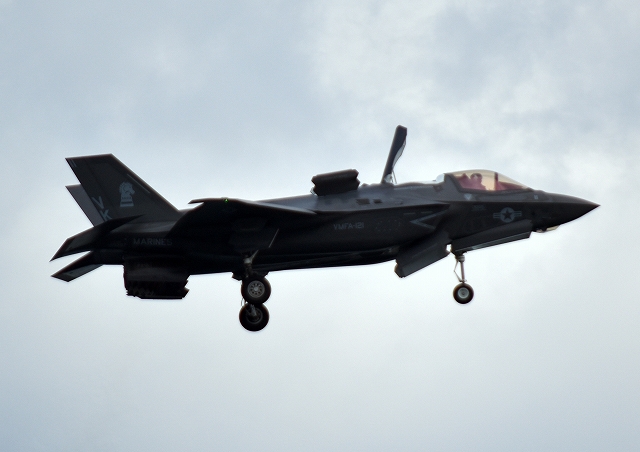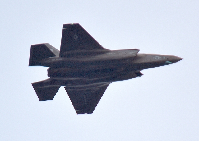 米海兵隊 F-35B ステルス 戦闘機(岩国基地)、VK、11番機が戻ってきて旋回 |