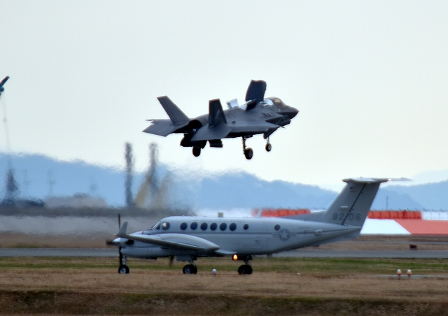 米海兵隊 UC-12W ヒューロン 輸送機(岩国基地)の前に米海兵隊 F-35B ステルス 戦闘機(岩国基地)、VK、11番機 |