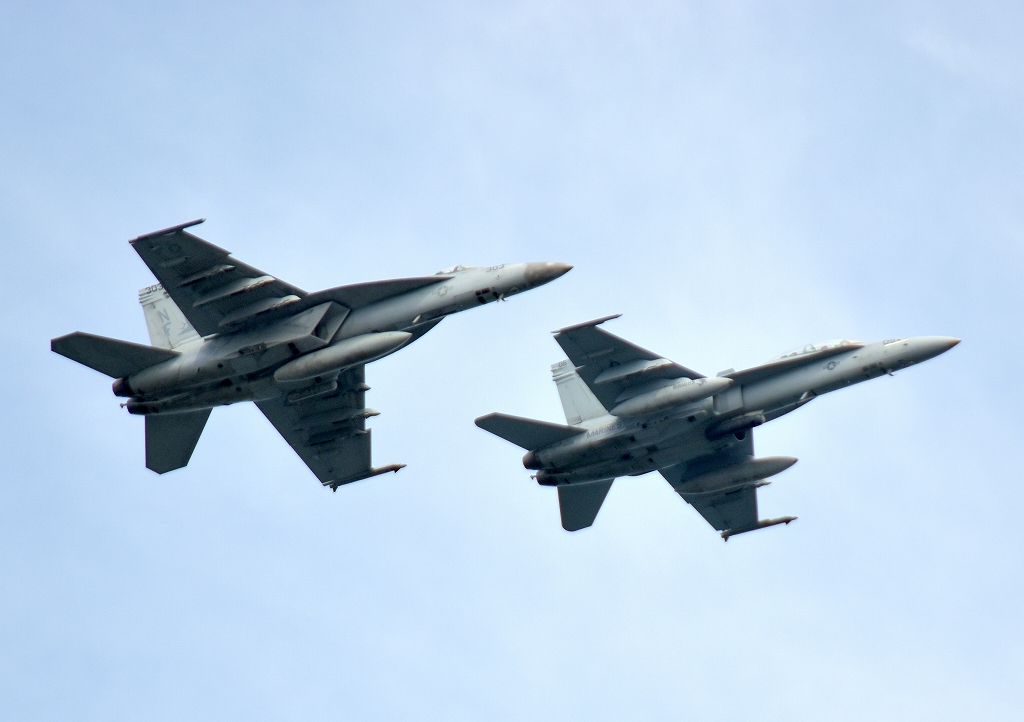 1965-078 2018年4月26日(木) 米海軍艦載機 F/A-18E スーパーホーネット 戦闘攻撃機(岩国基地)、NF、303番機、米海兵隊 F/A-18D ホーネット 戦闘攻撃機(岩国基地)、ED、05番機の2機編隊が帰還