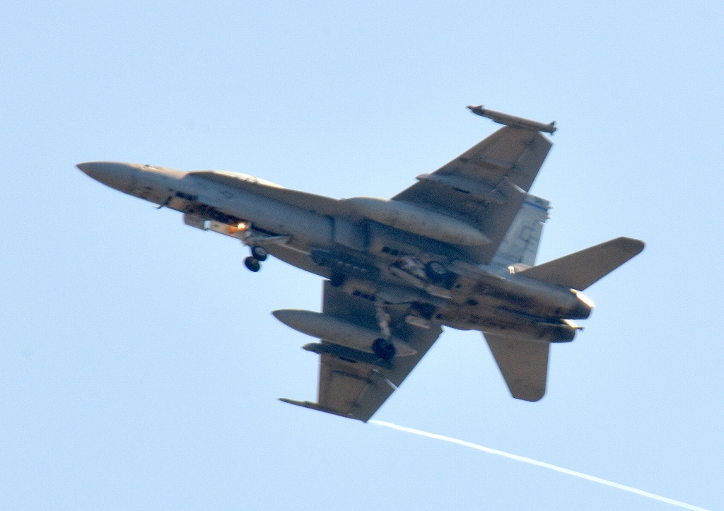 )米海兵隊 F/A-18D ホーネット 戦闘攻撃機(岩国基地)、CE、06番機がタッチアンドゴーして旋回(3周目)