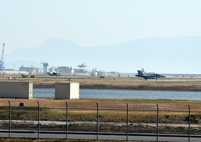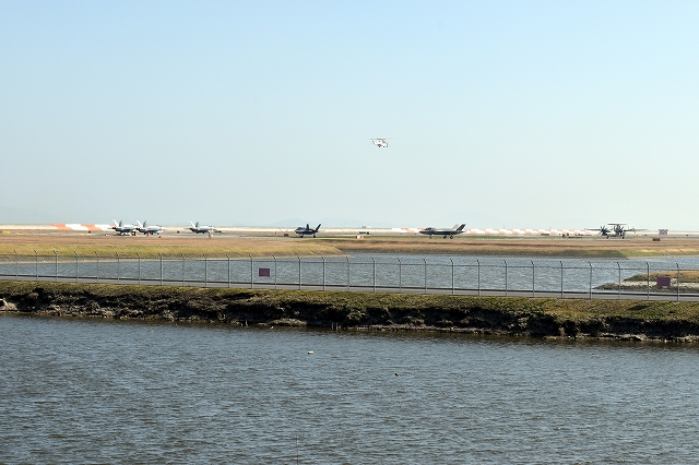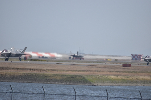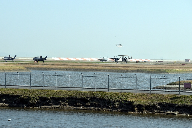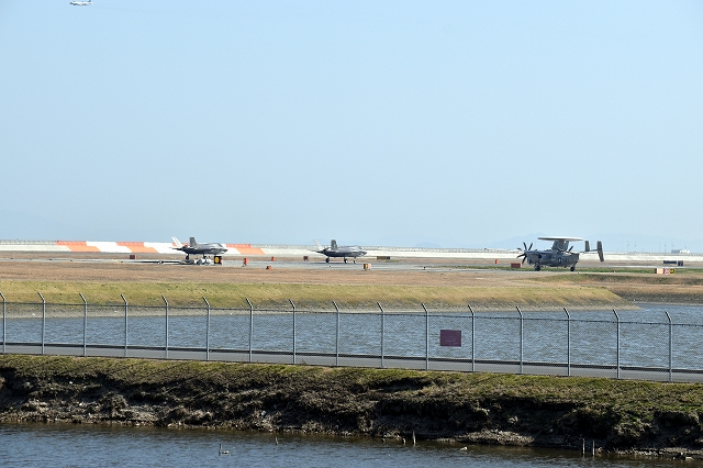 米海軍艦載機 EA-18G グラウラー 電子戦機(岩国基地)、NF、501番機、502番機、505番機 誘導路には米海兵隊 F-35B ステルス 戦闘機(岩国基地)、VK、01番機、08番機、米海軍艦載機 E-2D ホークアイ 早期警戒機(岩国基地)、603番機 |