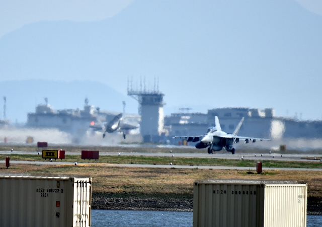 米海兵隊 F-35B ステルス 戦闘機(岩国基地)、VK、08番機が離陸 米海軍艦載機 F/A-18F スーパーホーネット 戦闘攻撃機(岩国基地)、NF、112番機、113番機 |