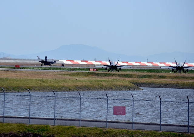 米海兵隊 F/A-18D ホーネット 戦闘攻撃機(岩国基地)、ED、05番機、07番機の前で米海兵隊 F-35B ステルス 戦闘機(岩国基地)、VK、13番機が離陸 |