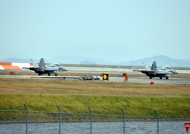 米海兵隊 F/A-18D ホーネット 戦闘攻撃機(岩国基地)、ED、05番機、07番機が離陸