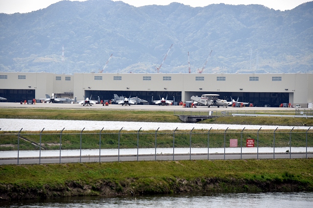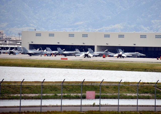 米海軍艦載機 EA-18G グラウラー 電子戦機(岩国基地)、NF、50?番機(右格納庫内)、500番機(左外) |
