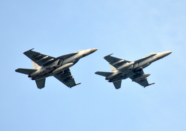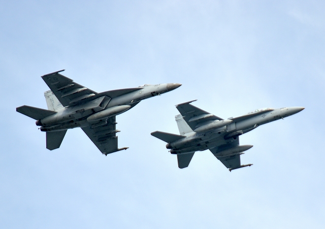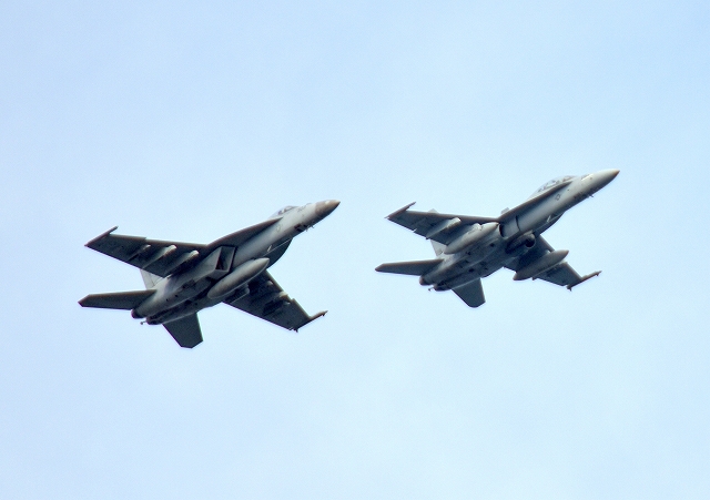米海軍艦載機 F/A-18E スーパーホーネット 戦闘攻撃機(岩国基地)、NF、303番機、米海兵隊 F/A-18D ホーネット 戦闘攻撃機(岩国基地)、ED、05番機の2機編隊