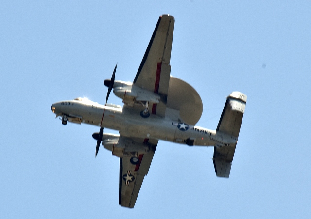 米海軍艦載機 E-2D ホークアイ 早期警戒機(岩国基地)、603番機が旋回(1周目) |