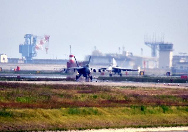 米海軍艦載機 F/A-18E スーパーホーネット 戦闘攻撃機(岩国基地)、NF、202番機、205番機が着陸 14時24分に編隊離した機です。1時間10分の飛行でした。 |