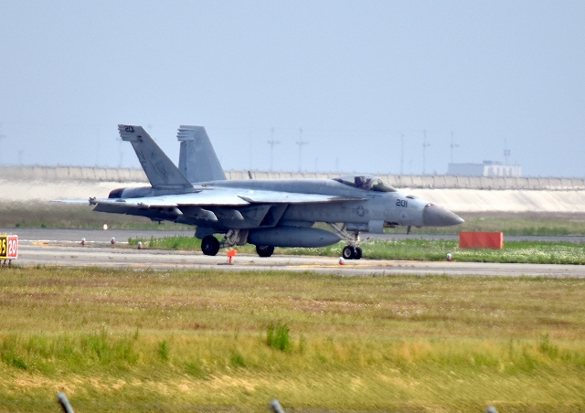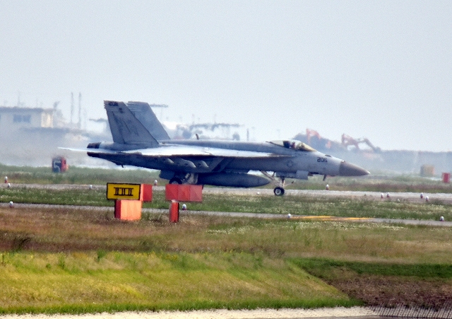 米海軍艦載機 F/A-18E スーパーホーネット 戦闘攻撃機(岩国基地)、NF、201番機が着陸 14時36分に離陸した機。1時間08分の飛行でした。 |