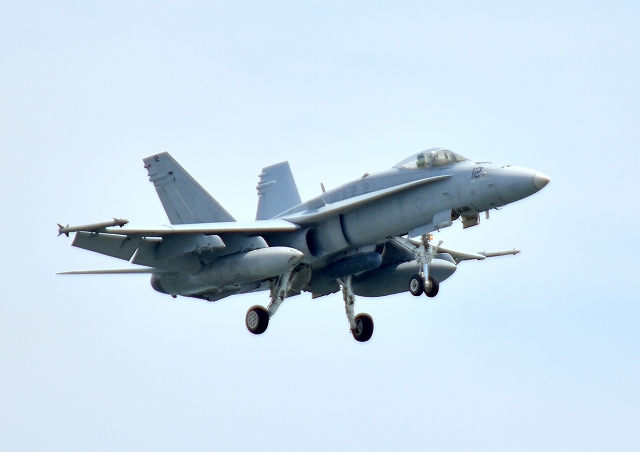 米海兵隊 F/A-18C ホーネット 戦闘攻撃機(岩国基地)、ED、12番機が着陸 9時30分離陸ということですから、1時間31分の飛行でした。 |