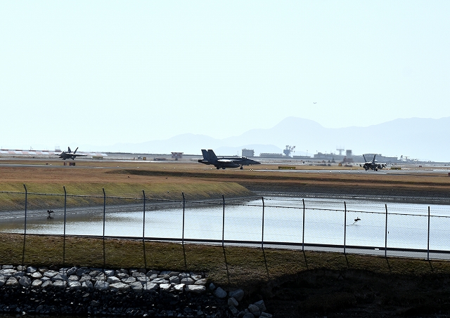 米海軍艦載機 F/A-18E スーパーホーネット 戦闘攻撃機(岩国基地)、NF、300番機、304番機、305番機が降りてきます。 |