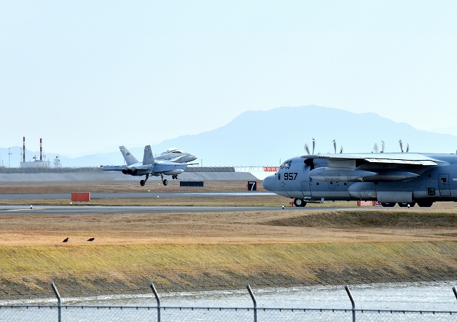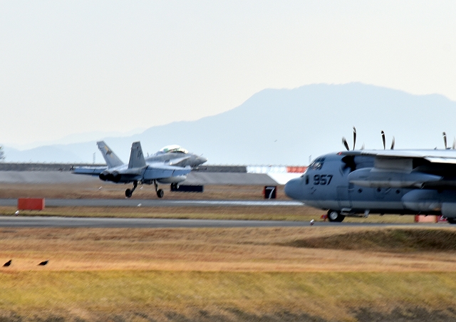 米海兵隊 F/A-18D ホーネット 戦闘攻撃機(岩国基地)、DT、03番機が着陸 12時02分に離陸した機。1時間07分の飛行でした。 |