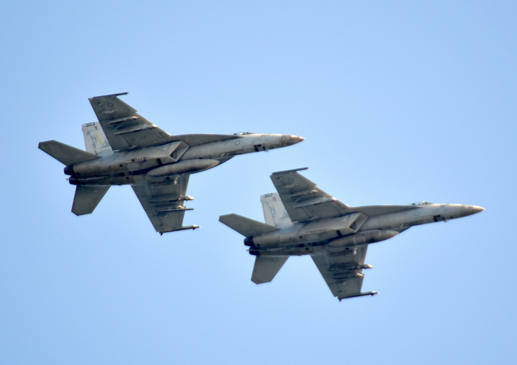米海軍艦載機 F/A-18E スーパーホーネット 戦闘攻撃機(岩国基地)、NF、307番機、303番機が帰還