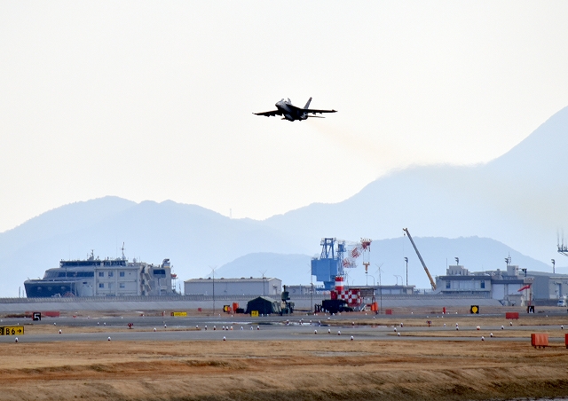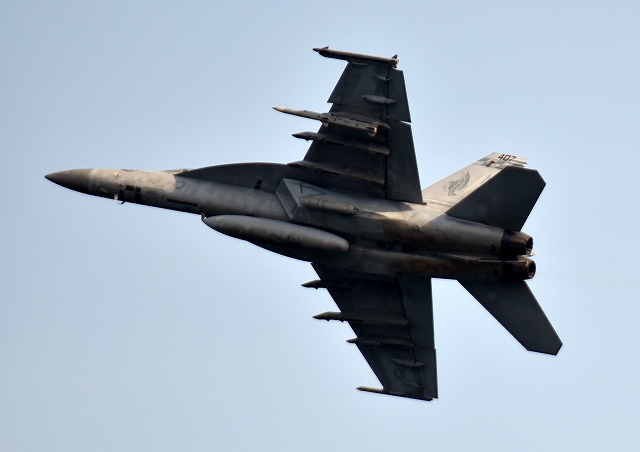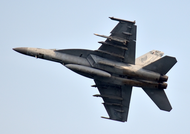 米海軍艦載機 F/A-18E スーパーホーネット 戦闘攻撃機(岩国基地)、NF、407番機が離陸 |