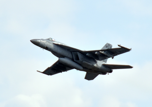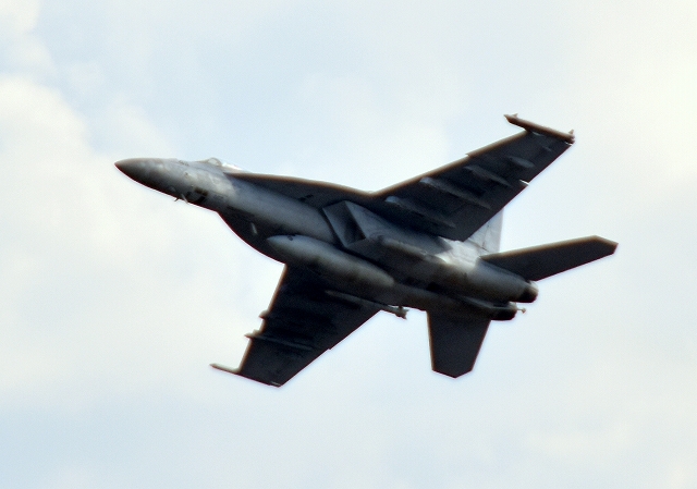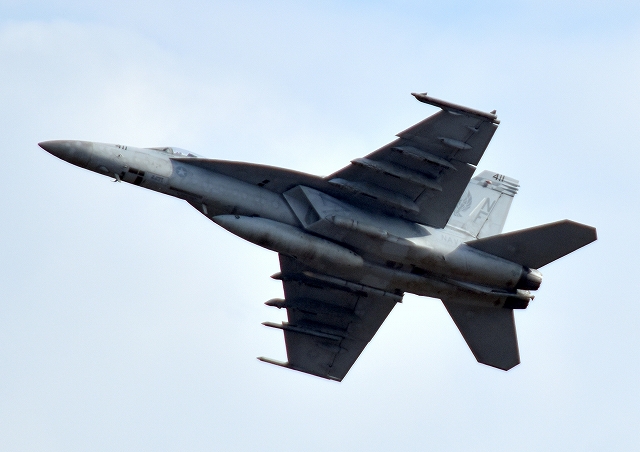 米海軍艦載機 F/A-18E スーパーホーネット 戦闘攻撃機(岩国基地)、NF、411番機が離陸 |