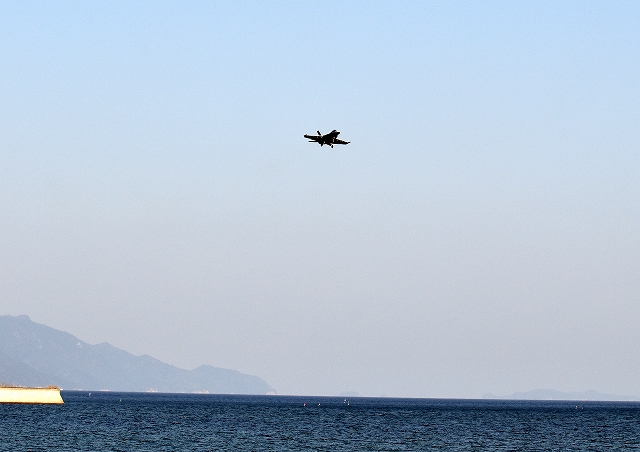 米海軍艦載機 F/A-18F スーパーホーネット 戦闘攻撃機(岩国基地)、105番機が着陸 |