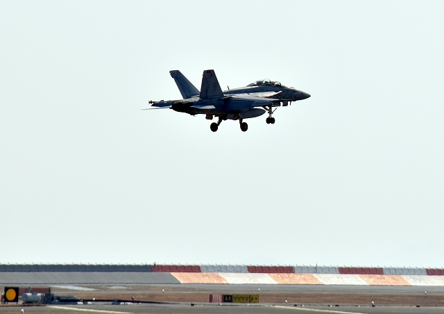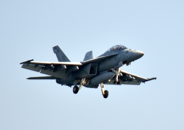 米海軍艦載機 F/A-18F スーパーホーネット 戦闘攻撃機(岩国基地)、103番機が着陸 |