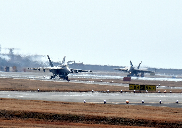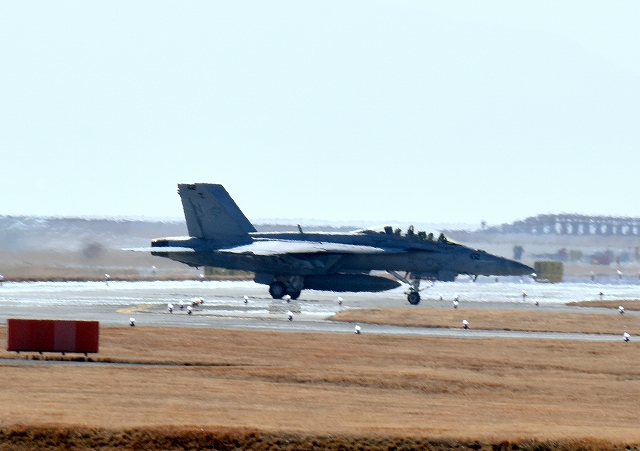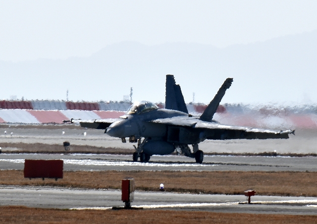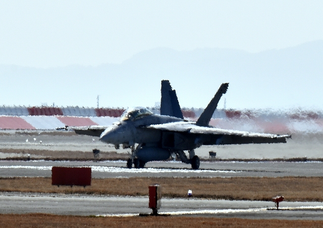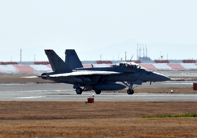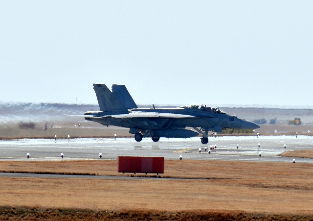 米海軍艦載機 F/A-18F スーパーホーネット 戦闘攻撃機(岩国基地)、NF、100番機が着陸 10時 |