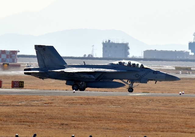 米海軍艦載機 F/A-18F スーパーホーネット 戦闘攻撃機(岩国基地)、NF、103番機が着陸 |