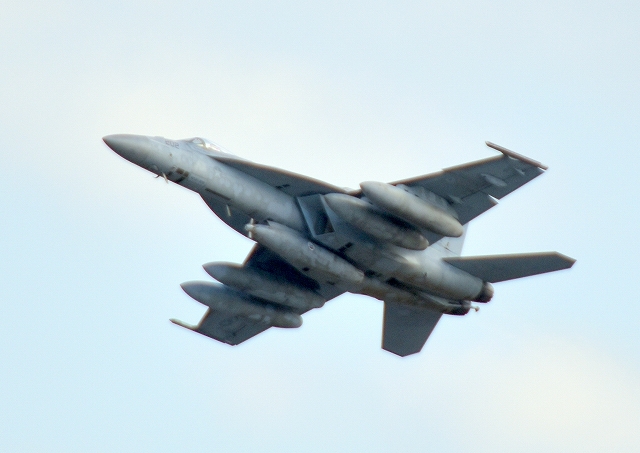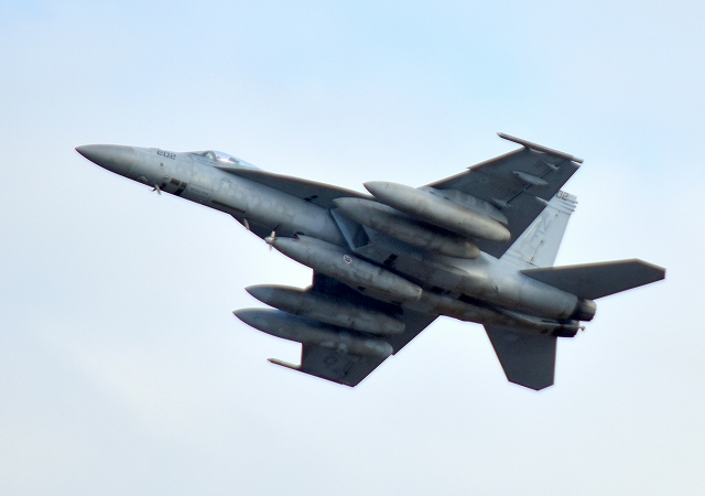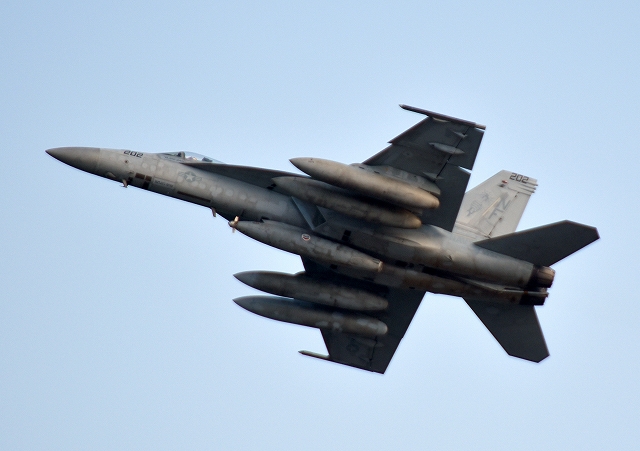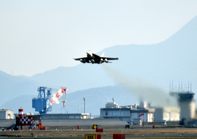 米海軍艦載機 F/A-18E スーパーホーネット 戦闘攻撃機(岩国基地)、NF、202番機が離陸 |