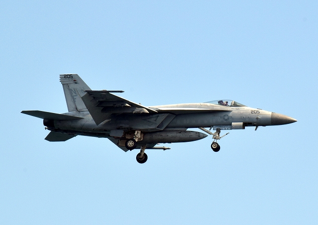 米海軍艦載機 F/A-18E スーパーホーネット 戦闘攻撃機(岩国基地)、NF、205番機が着陸 |