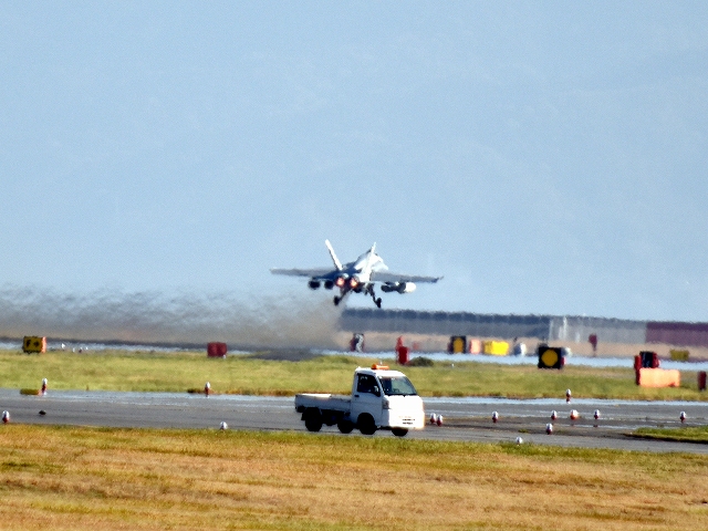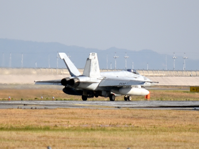米海軍艦載機 F/A-18E スーパーホーネット 戦闘攻撃機(岩国基地)、NF、202番機が離陸 |