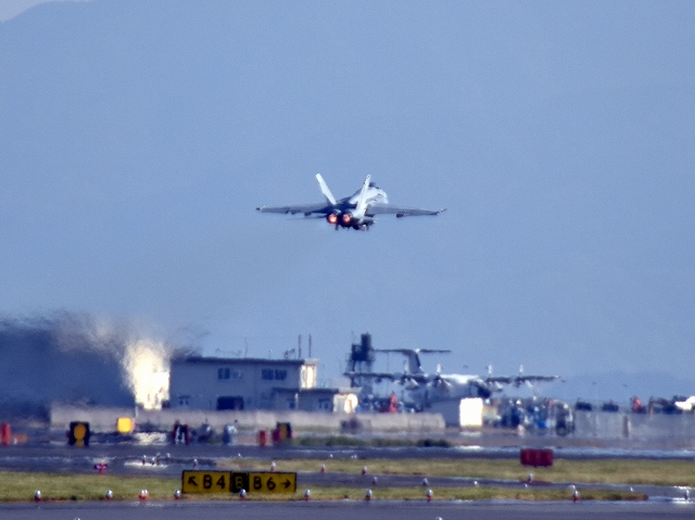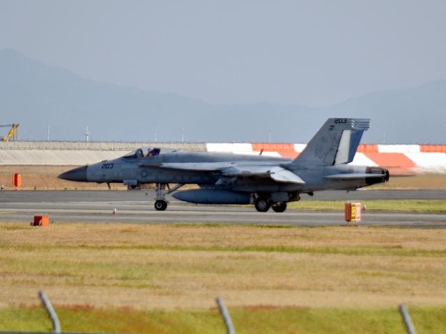 米海軍艦載機 F/A-18E スーパーホーネット 戦闘攻撃機(岩国基地)、NF、203番機が離陸 |