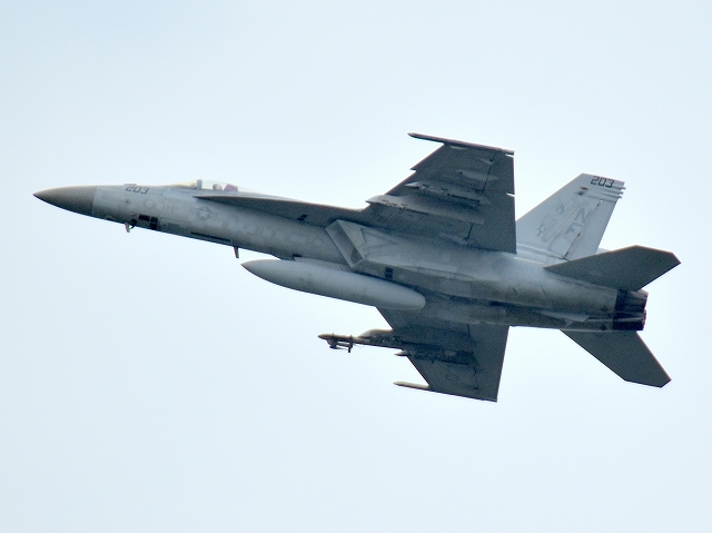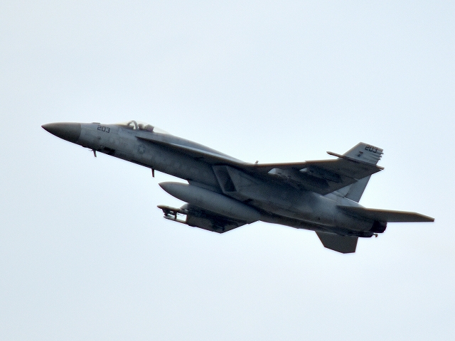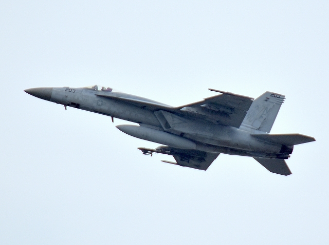 米海軍艦載機 F/A-18E スーパーホーネット 戦闘攻撃機(岩国基地)、NF、203番機が離陸 |