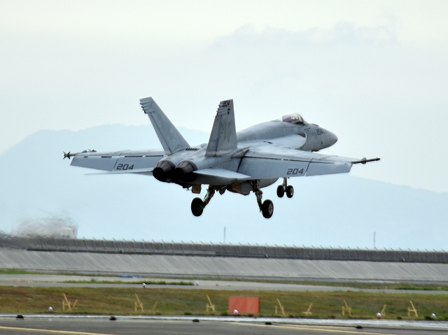 米海軍艦載機 F/A-18E スーパーホーネット 戦闘攻撃機(岩国基地)、NF、204番機が着陸 13時03分に離陸した機。1時間51分の飛行でした。 |