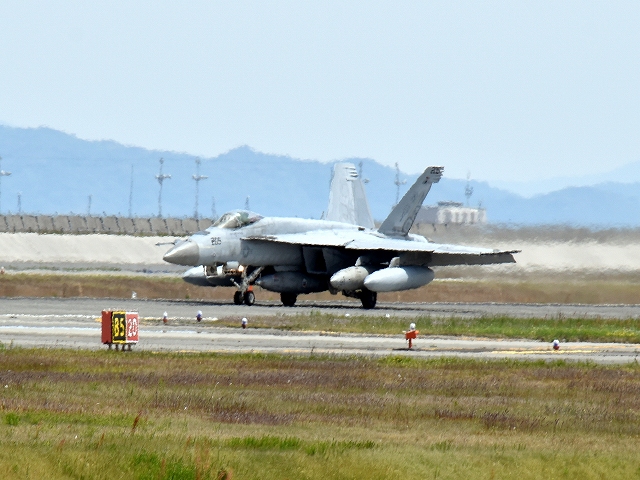 米海軍艦載機 F/A-18E スーパーホーネット 戦闘攻撃機(岩国基地)、NF、205番機が着陸 |