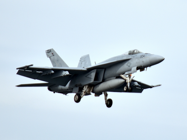 米海軍艦載機 F/A-18E スーパーホーネット 戦闘攻撃機(岩国基地)、NF、204番機が着陸 15時52分に離陸した機。18分間の飛行でした。 |