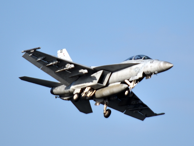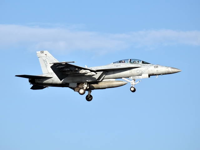 米海軍艦載機 F/A-18F スーパーホーネット 戦闘攻撃機(岩国基地)、NF、102番機が旋回(1周目) |