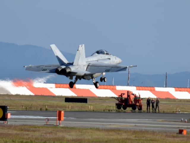 米海軍艦載機 F/A-18F スーパーホーネット 戦闘攻撃機(岩国基地)、NF、102番機がタッチアンドゴーして旋回(1周目) 下に光学式着艦誘導装置 |