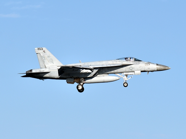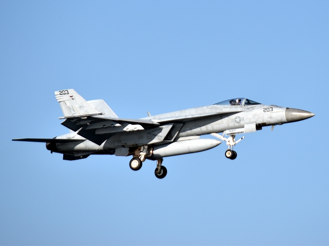 米海軍艦載機 F/A-18E スーパーホーネット 戦闘攻撃機(岩国基地)、NF、203番機が旋回(5周目) |
