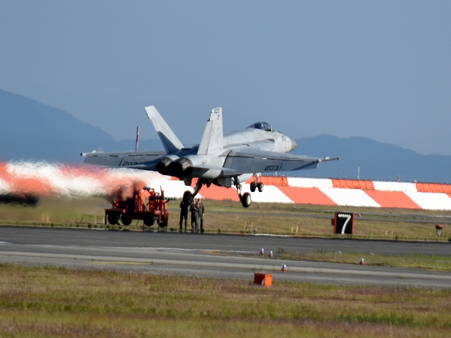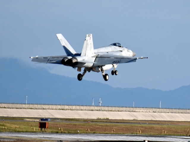 米海軍艦載機 F/A-18E スーパーホーネット 戦闘攻撃機(岩国基地)、NF、203番機がタッチアンドゴーして旋回(5周目) 下に光学式着艦誘導装置装置 |
