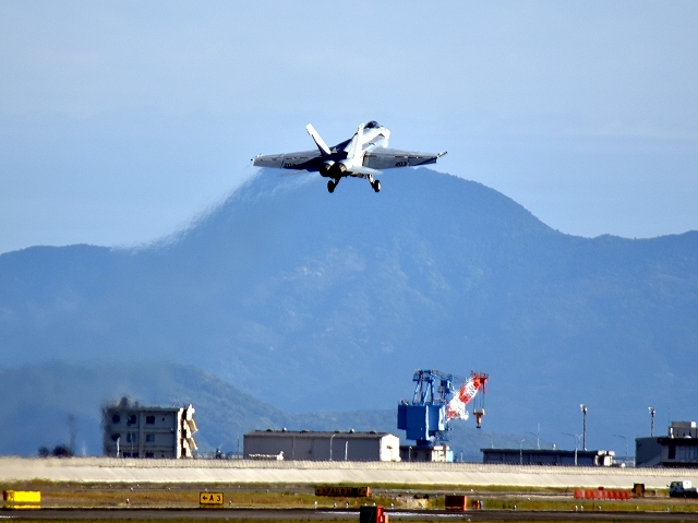 米海軍艦載機 F/A-18E スーパーホーネット 戦闘攻撃機(岩国基地)、NF、203番機がタッチアンドゴーして旋回(5周目) |