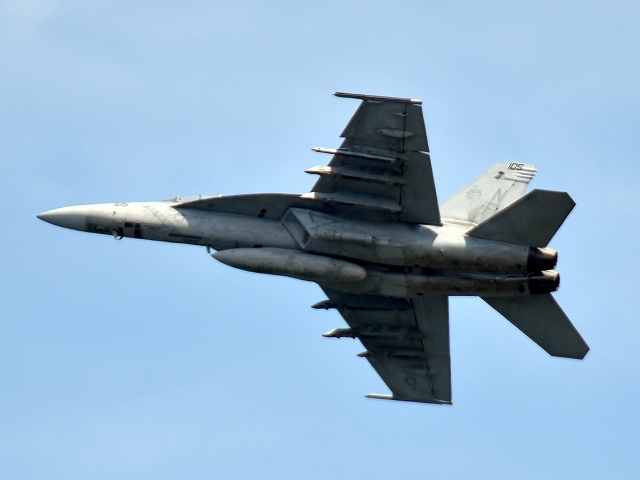 米海軍艦載機 F/A-18F スーパーホーネット 戦闘攻撃機(岩国基地)、NF、105番機が離陸 |