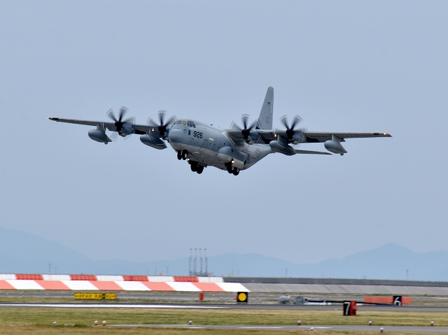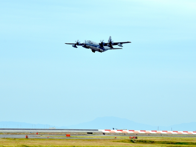 米海兵隊 KC-130J 空中給油機 スーパーハーキュリーズ(岩国基地)、9532番機がタッチアンドゴーして旋回(5周目) |